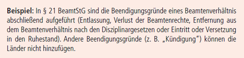 Das Beamtenstatusgesetz (BeamtStG) regelt unmittelbar das Statusrecht für die Länder. Einige Normen sind Vollregelung mit abschließender Geltung für die Länder. Sie entfaltet eine Sperrwirkung für die Landesgesetzgeber, da der Bund umfassend von seiner Gesetzgebungskompetenz aus Art. 74 Abs. 1 Nr. 27 GG Gebrauch gemacht hat. Wann eine Vorschrift im BeamtStG einen Bereich abschließend regelt, erschließt sich aus dem Regelungszusammenhang und der Rechtssystematik. So ist die Auflistung eines Katalogs bestimmter Voraussetzungen ein klarer Anhaltspunkt für eine abschließende Regelung.