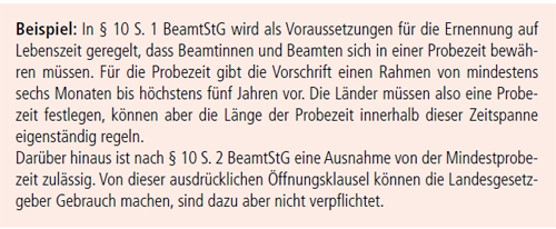 In einer Vielzahl der Regelungskomplexe haben die Landesgesetzgeber jedoch die Möglichkeit, vom BeamtStG abweichende oder zumindest ergänzende Regelungen zu schaffen. In einigen Normen des BeamtStG ist dies ausdrücklich durch eine Öffnungsklausel vorgesehen. Oftmals ergibt sich aber auch aus dem Regelungszusammenhang der Norm, dass die Landesgesetzgeber ergänzende oder konkretisierende Regelungen schaffen können, in vielen Fällen sogar schaffen müssen.